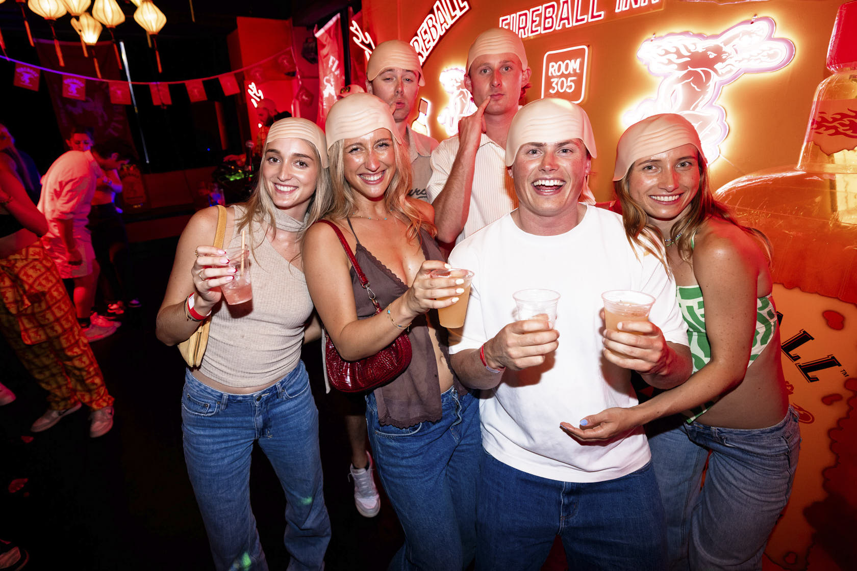 Inside Room 305 — the Fireball Inn’s spiritual HQ — influencers posed for “morning after” pics as if they’d actually stayed the night, while others sipped straight from the bubbler between rounds of karaoke in full suits. The whole scene was chaos in the best way — chrome domes gleaming, bottles clinking, and a sea of red cups catching the flash.