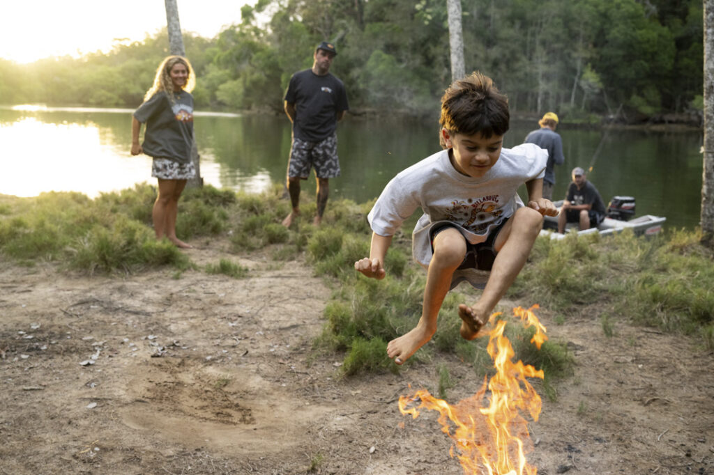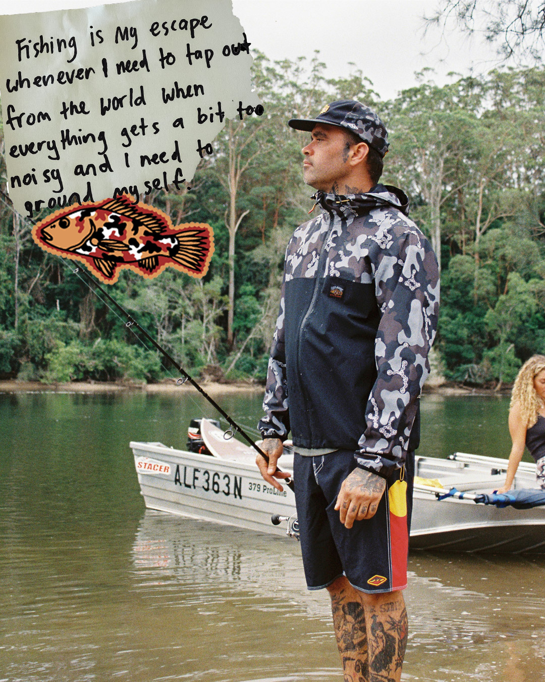 I mean, I love fishing. It’s kind of like my escape whenever I need to just sort of tap out from the world when everything gets a bit too noisy and I need to ground myself. I just love going fishing, walking the bank. And mangrove jack fishing’s one of my favourite types to fish to target. I just wanted to do a range where there’s a bit of fishing gear and a bit of just your regular sort of clothing. So the range is just inspired by just the love for fishing, being out on country, and just grounding myself. And yeah, that’s pretty much the crux of it.”