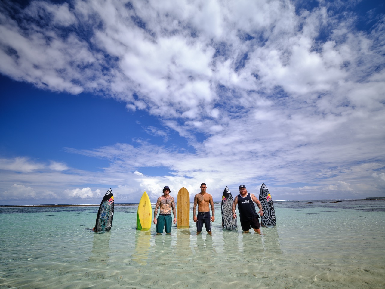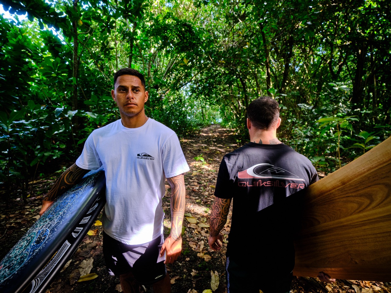 To source inspiration and help bring the concept to life, Quiksilver took Gibbs, Brooking and Butler on a journey through the Pacific, chasing waves while reflecting on their relationship with Moana and surfing’s history, past and present. That duality comes to life in Butler’s quiver from the trip — an Alaia board representing the sport’s earliest roots, a classic single fin symbolising surfing’s timeless soul, and a modern Sharpeye quad capturing its progressive future.