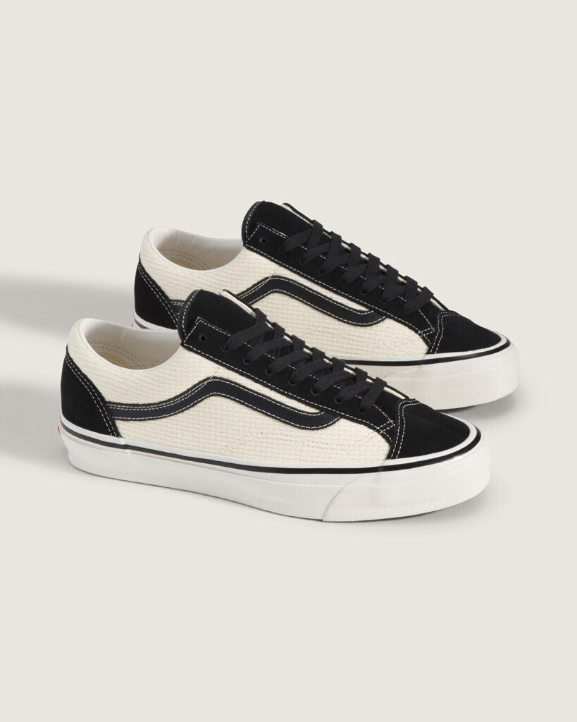 The drop sees them offer two re-imaginings of the Old Skool 36 — one in Black with Pearl Weave (the same fabric used in martial arts uniforms) and another in Navy/Red with an all-over logo print.